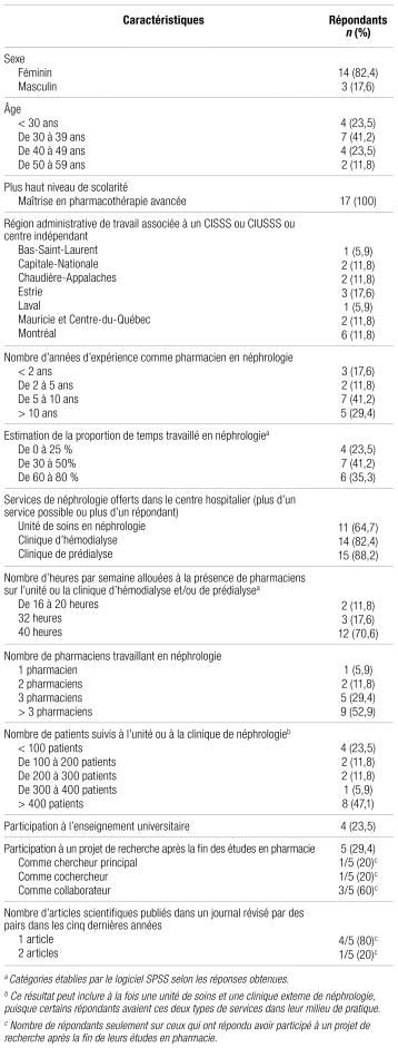 Les caractéristiques des 17 pharmaciens ayant répondu au sondage sont présentées dans le tableau I. La majorité des répondants sont de sexe féminin, ont entre 30 et 50 ans et travaillent dans une unité ou une clinique de néphrologie qui suit plus de 300 patients. Plus de la moitié ont déclaré passer au plus 50 % de leur temps en néphrologie et avoir plus de cinq ans d’expérience dans ce domaine. Près du tiers ont dit faire de l’enseignement universitaire et avoir participé à au moins un projet de recherche, à l’exclusion de la supervision des projets d’étudiants, après la fin de leurs études pharmaceutiques. Aucun répondant n’a poursuivi d’études supérieures en recherche après avoir obtenu son diplôme de maîtrise en pharmacothérapie avancée.