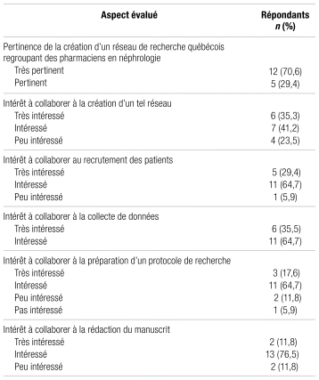 Results: Of the 17 respondents to the survey, 71% stated that the creation of a Quebec research network on pharmacists practice in nephrology is very relevant. Seventy-seven percent of them said they were prepared or very prepared to collaborate in the creation of such a network. Lack of time, experience, and funding were identified as the main obstacles to their participation, while determining and conducting statistical analyses were limiting factors. The main strategies for greater participation were the allocation of hours dedicated to research as well as access to mentoring programs and opportunities to collaborate on existing research.