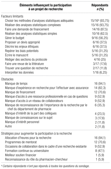 Les éléments que les répondants du sondage considèrent comme un facteur limitant ou un obstacle à la participation des pharmaciens à un projet de recherche sont assez variés (tableau III). Ainsi, les étapes avec lesquelles la plupart sont le moins à l’aise sont le choix d’une méthode d’analyse statistique adéquate, la réalisation d’analyses statistiques complexes et les demandes de financement. Les obstacles nommés par la plupart des répondants sont le manque de temps, d’expérience en recherche et de financement.