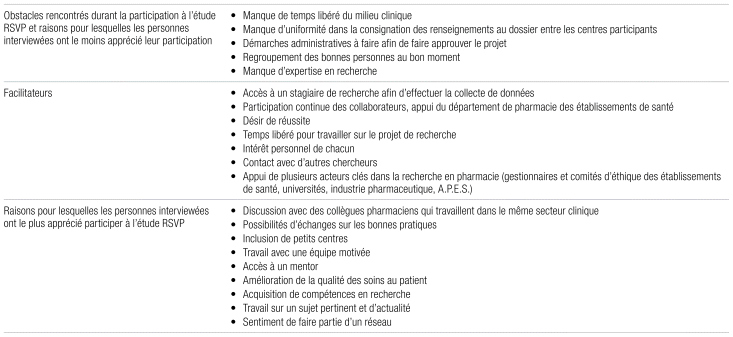 L’élément que les répondantes ont le plus apprécié de leur participation au projet de recherche était l’occasion qui leur était donnée de discuter avec leurs collègues pharmaciennes du même secteur clinique et de pouvoir échanger sur les bonnes pratiques. L’accès à un mentor en recherche et l’amélioration de la qualité des soins au patient ont aussi été mentionnés. Un autre facteur facilitant cité est l’appui de différents acteurs clés de la recherche en pharmacie, comme les gestionnaires des hôpitaux et les universités. Les gestionnaires ont accepté de libérer les pharmaciens du milieu clinique pour qu’ils puissent faire de la recherche, tandis que les universités ont fourni des mentors et des stagiaires de recherche et apporté une certaine crédibilité aux projets de recherche. L’industrie pharmaceutique a aussi été évoquée comme acteur important pour la subvention de projets de recherche.