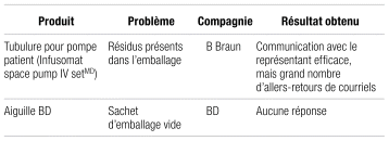 Néanmoins, le principal obstacle rencontré résidait souvent dans la lenteur administrative liée à la communication avec les compagnies. Au cours des quatre semaines du projet, huit compagnies ont été contactées une première fois par courriel et seulement trois ont répondu. Après un second courriel de rappel, une compagnie supplémentaire a finalement répondu. Cette inefficacité dans les échanges administratifs peut entraver la résolution rapide des problèmes liés aux fournitures pharmaceutiques et décourager complètement le processus de déclaration, posant ainsi un défi à la gestion de la défectuosité. Deux exemples se sont produits lors de la réalisation du projet et sont présentés dans le tableau 1.