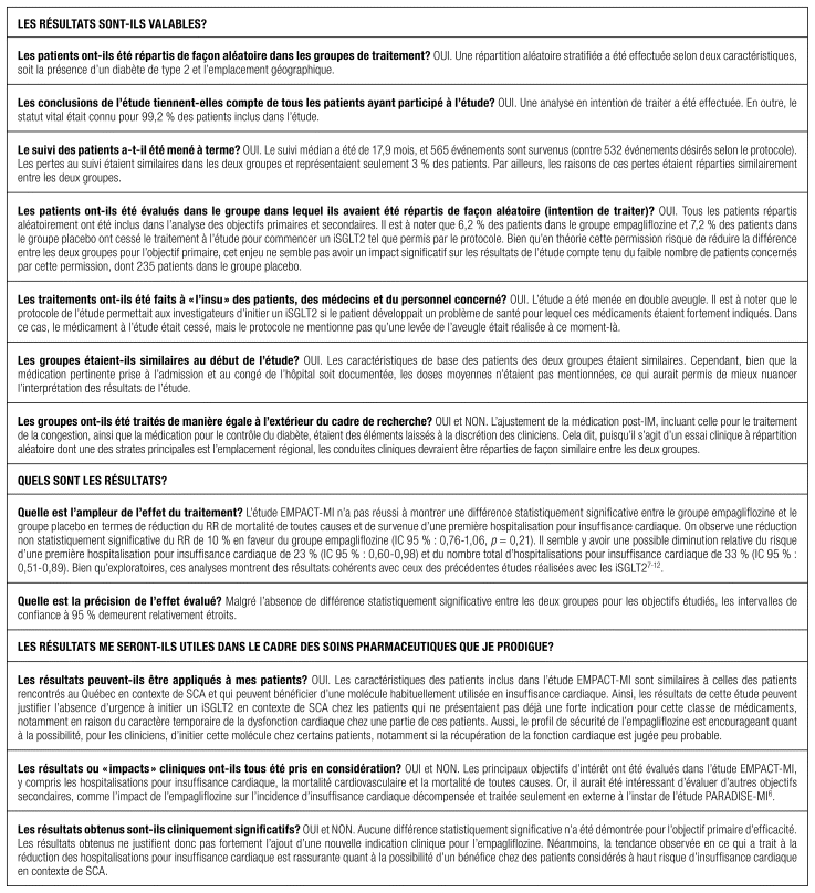 Protocole de recherche: EMPACT-MI est un essai clinique multicentrique de supériorité de phase III à répartition aléatoire stratifiée dans un ratio 1:1, contrôlé et mené à double insu. La présence d’un antécédent de diabète de type 2 et l’emplacement géographique constituaient les strates de répartition aléatoire des sujets de l’étude. La survenue de 532 événements de l’objectif primaire a été jugée nécessaire pour obtenir une puissance statistique de 85 % permettant de déceler une différence de rapport de risque (RR) de 23 % avec une valeur alpha bilatérale de 0,05. L’analyse en intention de traiter a été choisie pour le paramètre composite primaire ainsi que pour les composantes le constituant, avec une hiérarchisation des analyses statistiques selon la procédure de Hochberg. En effet, le test statistique du premier et second objectif secondaire n’est effectué que si une différence significative du paramètre composite primaire a été démontrée. Les troisième et quatrième objectifs secondaires ne sont testés que si les tests des deux premiers objectifs secondaires montrent une différence statistiquement significative. Les patients étaient évalués au quatorzième jour suivant l’inclusion dans l’étude, au sixième mois, puis tous les cinq mois jusqu’à la fin de l’étude. La majorité des suivis ont été effectués à distance, à l’exception du suivi fait six mois après la répartition aléatoire qui s’est déroulé en personne. Par ailleurs, la collecte des données de sécurité a été réalisée de façon pragmatique, dans la mesure où seuls les effets indésirables graves, ceux ayant causé l’arrêt du traitement durant plus de six jours ou ceux d’intérêts particuliers, comme l’acidocétose euglycémique, ont été inclus. Enfin, un statisticien indépendant a révisé les principales analyses effectuées.