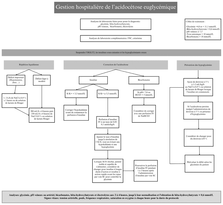 Actuellement, certains hôpitaux au Québec ne possèdent pas de protocole préétabli spécifique concernant le traitement des acidocétoses, et certains protocoles existants n’abordent pas les acidocétoses euglycémiques causées par les iSGLT2.