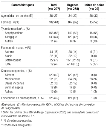 Parmi les 511 cas de réactions anaphylactiques répertoriés, 214 ont été exclus. Il s’agissait d’enfants, de cas d’anaphylaxie pris en charge au bloc opératoire ou en clinique externe ou de doublons. Finalement, 297 cas ont donc été retenus. Les caractéristiques de la population à l’étude sont décrites dans le tableau I.