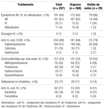 Des 297 réactions incluses, 256 ont reçu au moins un traitement pharmacologique durant leur prise en charge au CHU de Québec–UL et 79 patients ont reçu de l’épinéphrine en préhospitalier sans administration subséquente au cours de la prise en charge intrahospitalière. En tout, 270 patients (91 %) ont eu au moins une dose d’épinéphrine, toutes voies d’administration confondues, y compris les doses avant l’arrivée à l’hôpital et celles à l’hôpital, soit 251 à l’urgence et 19 sur les unités. L’épinéphrine a été donnée par voie intraveineuse à quatre patients n’en ayant pas reçu au préalable par voie intramusculaire. Les patients à qui l’épinéphrine a été administrée par nébulisation en avaient tous reçu au préalable par voie parentérale. La dose d’épinéphrine par voie intramusculaire la plus utilisée était de 0,3 mg, suivie de 0,5 mg. Pour l’épinéphrine par voie intraveineuse, la perfusion a été davantage employée que le bolus. Les doses étaient variables, avec des débits initiaux de 0,01 à 0,5 μg/kg/min et des bolus de 0,1 à 1 mg. Il n’y a pas eu d’administration par voie sous-cutanée.