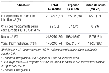Les doses d’épinéphrine reçues en préhospitalier ont été considérées pour évaluer l’ordre d’administration des traitements. La prise en charge à l’urgence a été comparée à celle des unités de soins. Nous avons aussi répertorié les causes potentielles d’anaphylaxie et, lorsqu’elles étaient possiblement de nature médicamenteuse, nous avons vérifié si la pharmacie de l’établissement en avait été avisée. Enfin, dans une perspective de prise en charge globale, nous avons déterminé le nombre de patients orientés en immuno-allergologie et vérifié la fréquence de prescription d’épinéphrine auto-injectable au congé.