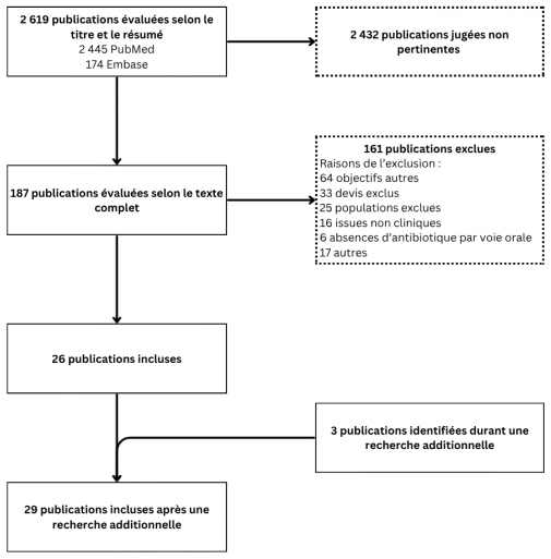 Cette revue de littérature comporte toutefois certaines limites. Tout d’abord, l’accessibilité aux ressources a été un problème, ce qui explique pourquoi les articles écrits dans une autre langue que l’anglais ou le français, sans traduction disponible, ont été exclus. De plus, l’inclusion du terme « oral » dans la stratégie de recherche semble avoir limité la sensibilité de la recherche, car certains articles d’intérêt n’ont pas été trouvés. À l’inverse, son exclusion conduisait à une recherche beaucoup trop sensible et peu spécifique menant à environ 29 000 articles. Par conséquent, il a été convenu d’inclure le terme « oral » afin de demeurer réaliste dans l’envergure du projet et de faire une recherche additionnelle moins exhaustive sur chaque molécule dans le cas où le nombre d’articles serait faible afin de pallier cette limite. Cette façon de faire aurait d’ailleurs pu limiter le nombre de données probantes pour les molécules moins utilisées, telles que la doxycycline, l’amoxicilline-clavulanate et le céfadroxil.