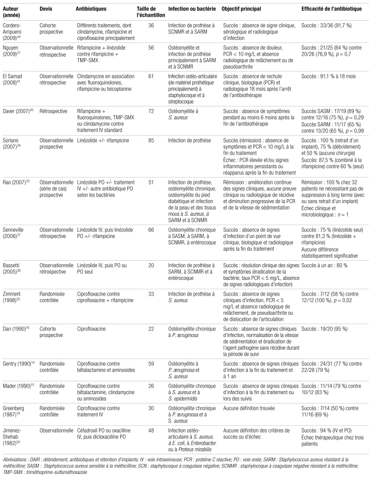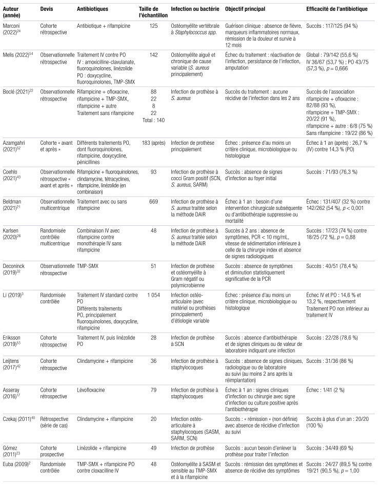 Sources des données et sélection des études: Une revue de la littérature sur l’efficacité de plusieurs antibiotiques administrés par voie orale (fluoroquinolones, rifampicine, triméthoprime-sulfaméthoxazole, linézolide, clindamycine, amoxicilline-clavulanate, céfadroxil et doxycycline) dans le traitement des ostéomyélites et des infections de prothèse a été réalisée sur PubMed et Embase. La qualité des études et les niveaux de preuves ont été évalués avec la méthode SORT.