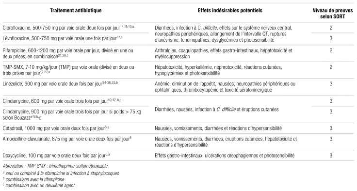 Revue du sujet traité: Au total, 2 619 études ont été identifiées, dont 34 ont été incluses. La ciprofloxacine, la rifampicine et le triméthoprime-sulfaméthoxazole sont les molécules administrées par voie orale les plus étudiées. Les données pour le linézolide, la clindamycine et le céfadroxil diffèrent, et aucune étude n’a évalué spécifiquement l’amoxicilline-clavulanate et la doxycycline administrées par voie orale. Ainsi, des données appuient l’utilisation des antibiotiques par voie orale, mais elles sont souvent de faible qualité du fait qu’elles proviennent souvent de petites études observationnelles.