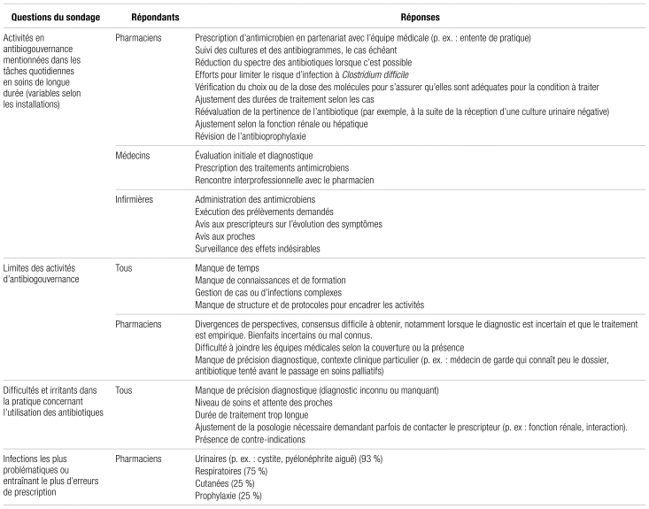 Dans un deuxième temps, nous avons rencontré les membres du Département de pharmacie exerçant en soins de longue durée afin de connaître leurs besoins et de recueillir leurs commentaires initiaux relatifs à la mise en place d’un programme d’antibiogouvernance. Dans le but de mieux cibler les enjeux actuels et de créer un portrait de la réalité des équipes traitantes, un court sondage en ligne (Teams, Microsoft, Redmond, Washington, É-U) de 12 questions a été transmis par courriel aux pharmaciens (n = 16), aux médecins (n = 3) et aux infirmières (n = 14) œuvrant en soins de longue durée. Le tableau I présente les résultats du sondage sur les perceptions et les problèmes des équipes traitantes liés à l’antibiogouvernance.