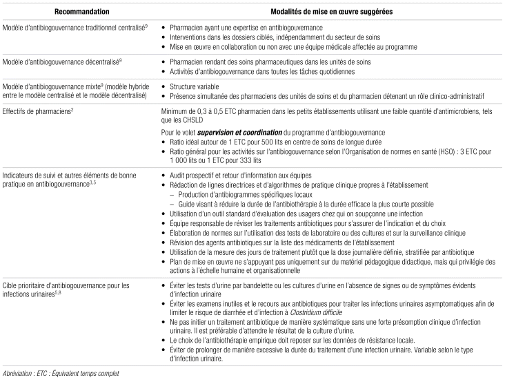 Tableau II Résumé des recommandations tirées de la littérature sur l’antibiogouvernance en contexte de soins de longue durée