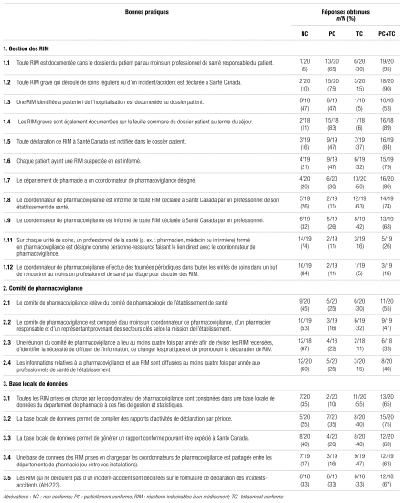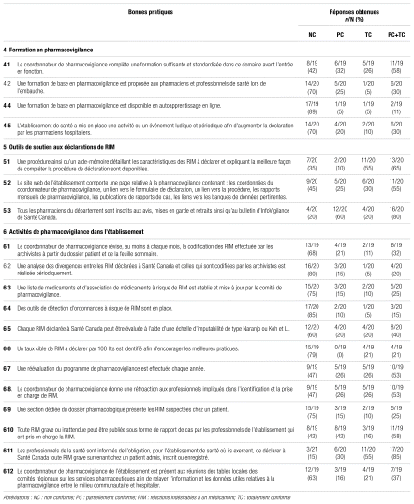 Nous avons évalué la conformité des établissements à un ensemble de bonnes pratiques de pharmacovigilance élaboré dans le cadre d’un sondage effectué auprès de tous les membres de la communauté de pratique publié en 20198.