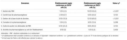 Tableau III Profil du nombre d’établissements conformes aux bonnes pratiques de pharmacovigilance pour chacun des six domaines de critères en 2019 et en 2023