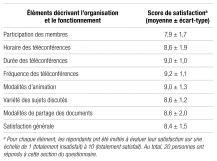 Afin d’évaluer la satisfaction des membres de la communauté de pratique en pharmacovigilance, les répondants avaient également indiqué leur niveau de satisfaction sur une échelle de 1 (totalement insatisfait) à 10 (totalement satisfait) à l’égard de huit éléments entourant le fonctionnement de la communauté de pratique : participation des membres, horaire des téléconférences (mercredi à 15 h), durée des téléconférences (60 minutes), fréquence des téléconférences (quatre fois par année), modalités d’animation, variété des sujets discutés, modalités de partage des documents et satisfaction générale.