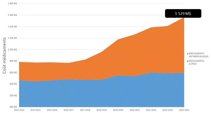 CONSTAT : Le coût de médicaments en établissement de santé représente une dépense majeure pour l’État québécois, soit 1,5 milliard de dollars en 2023–2024. Cette dépense a augmenté de 203 % en 10 ans.