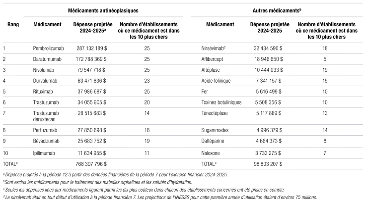 Pour les antinéoplasiques, les 10 médicaments les plus coûteux, et tout particulièrement les cinq premiers, sont à peu près les mêmes dans les 25 établissements qui offrent des traitements contre le cancer chez l’adulte. L’Institut de cardiologie et le Centre hospitalier universitaire (CHU) Sainte-Justine n’en font pas partie. À titre indicatif, la dépense projetée pour ces 10 médicaments en 2024–2025 représente environ 50 % des dépenses de médicaments totales en 2023–2024. Le pembrolizumab est de loin le médicament représentant la plus grande dépense au Québec. À lui seul (selon les projections de 2024–2025), il représente environ 20 % des dépenses de médicaments totales en 2023–2024. Le pembrolizumab a été inscrit à la liste des médicaments fournis en établissement par la Régie de l’assurance maladie du Québec (RAMQ) pour la première fois comme médicament d’exception en 2015–201611. En 2024–2025, il était approuvé pour 21 indications11.